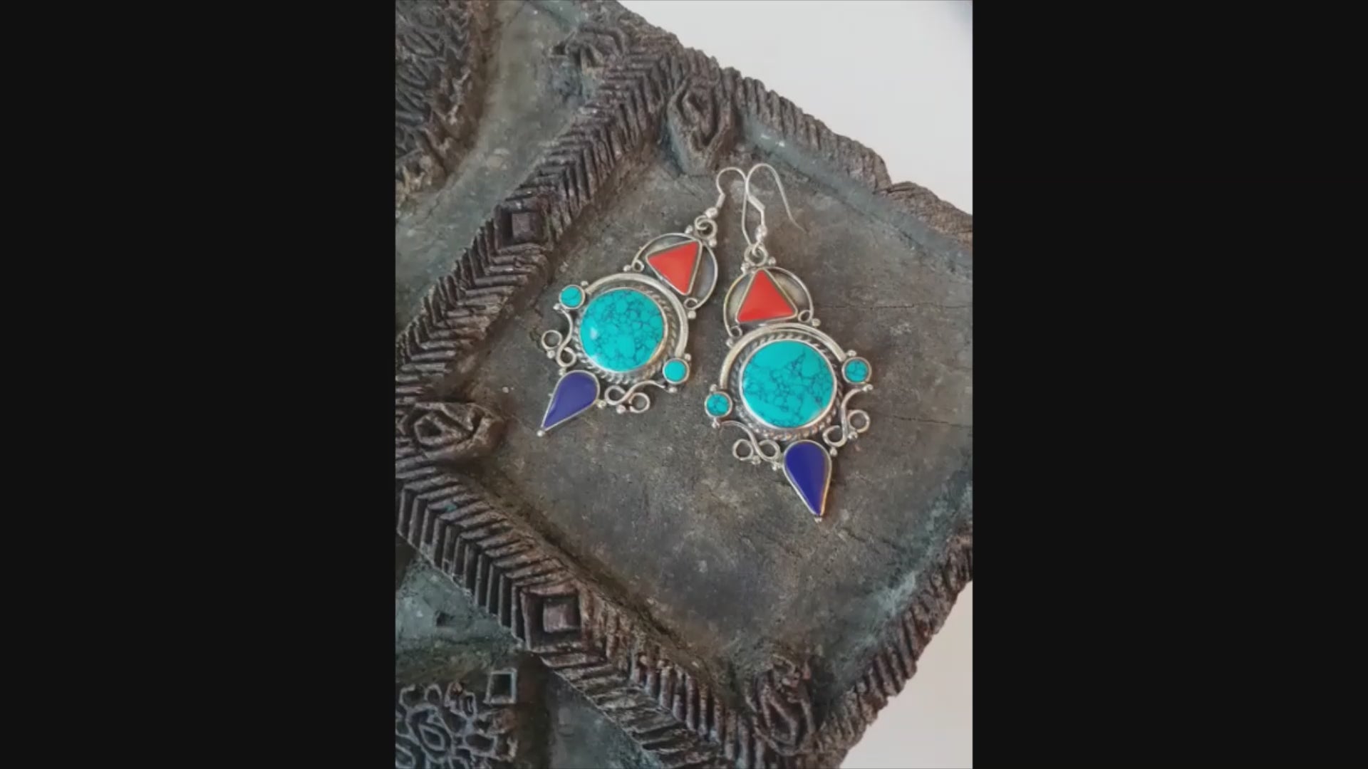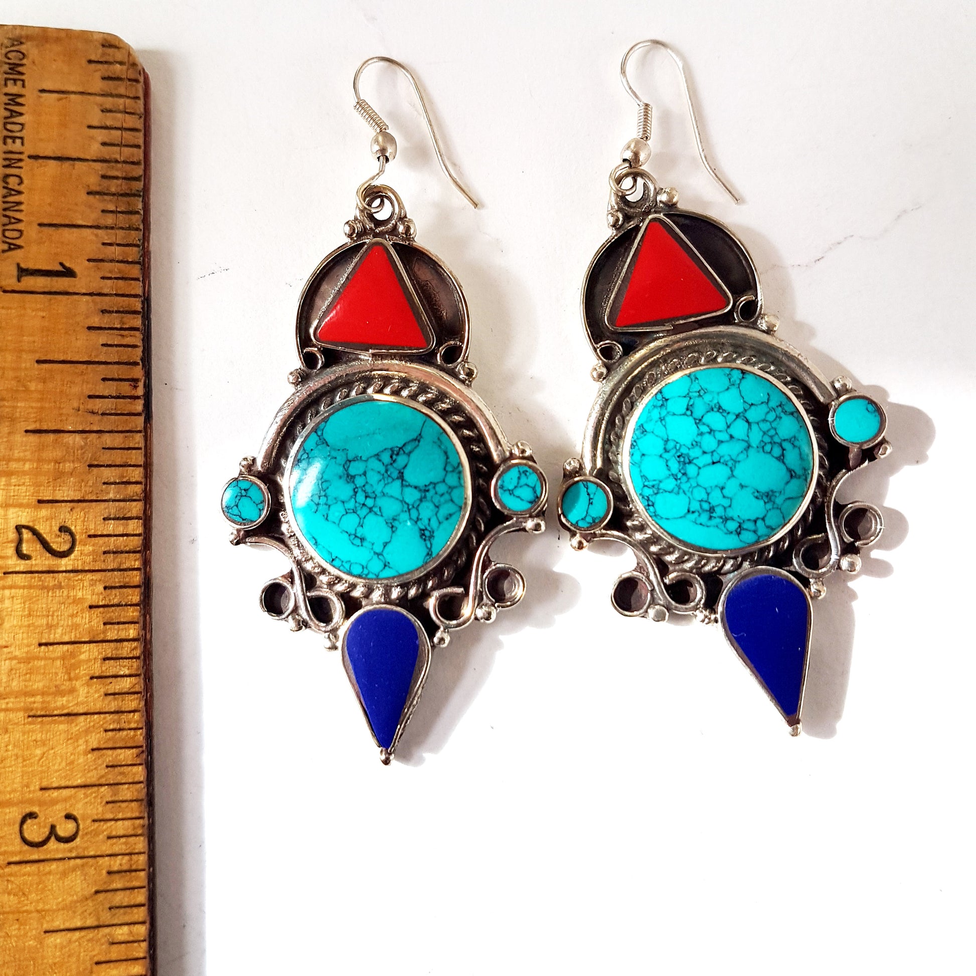 Boucles d’oreilles boho tibétaines dramatiques. Design en argent antique avec émail turquoise, corail et lapis.