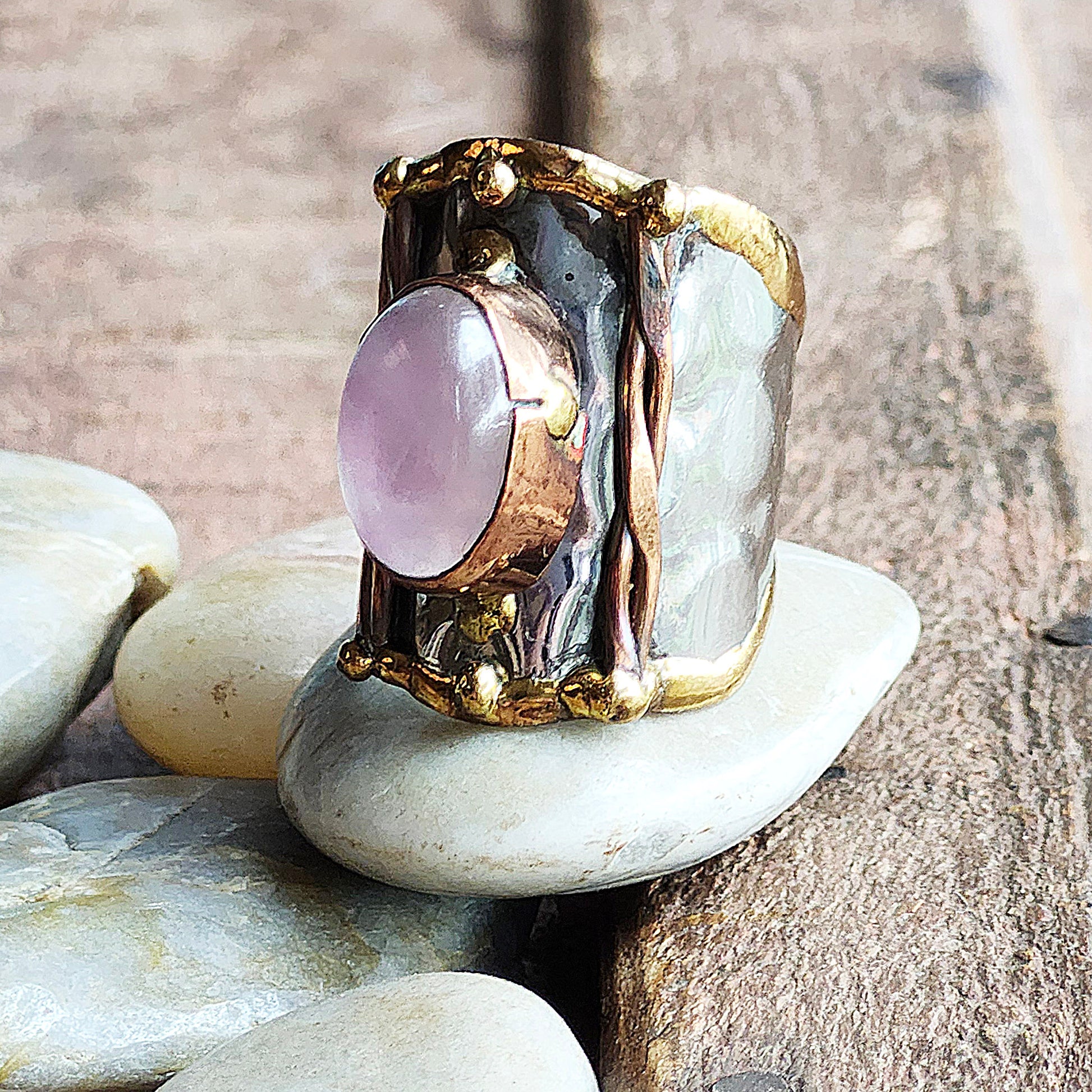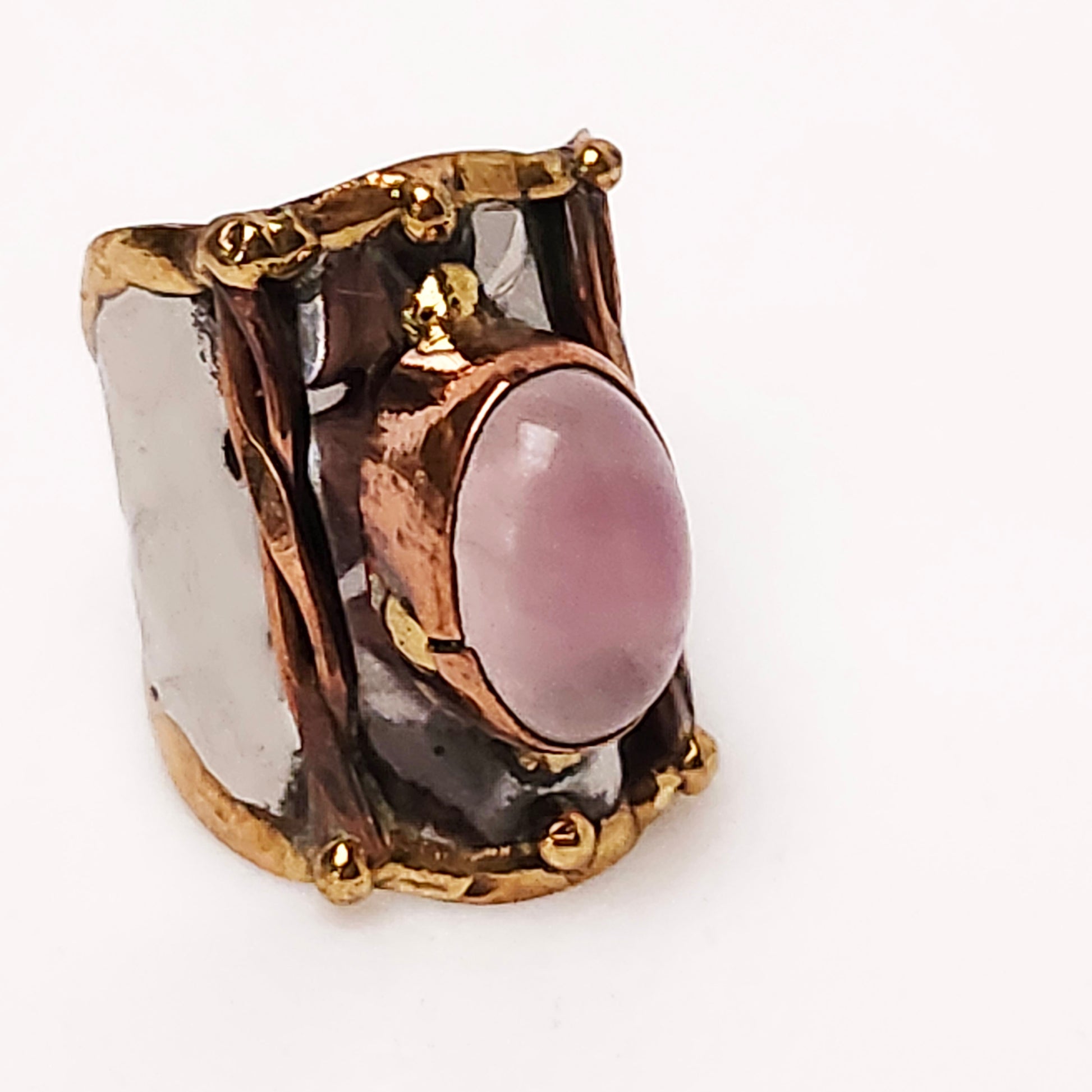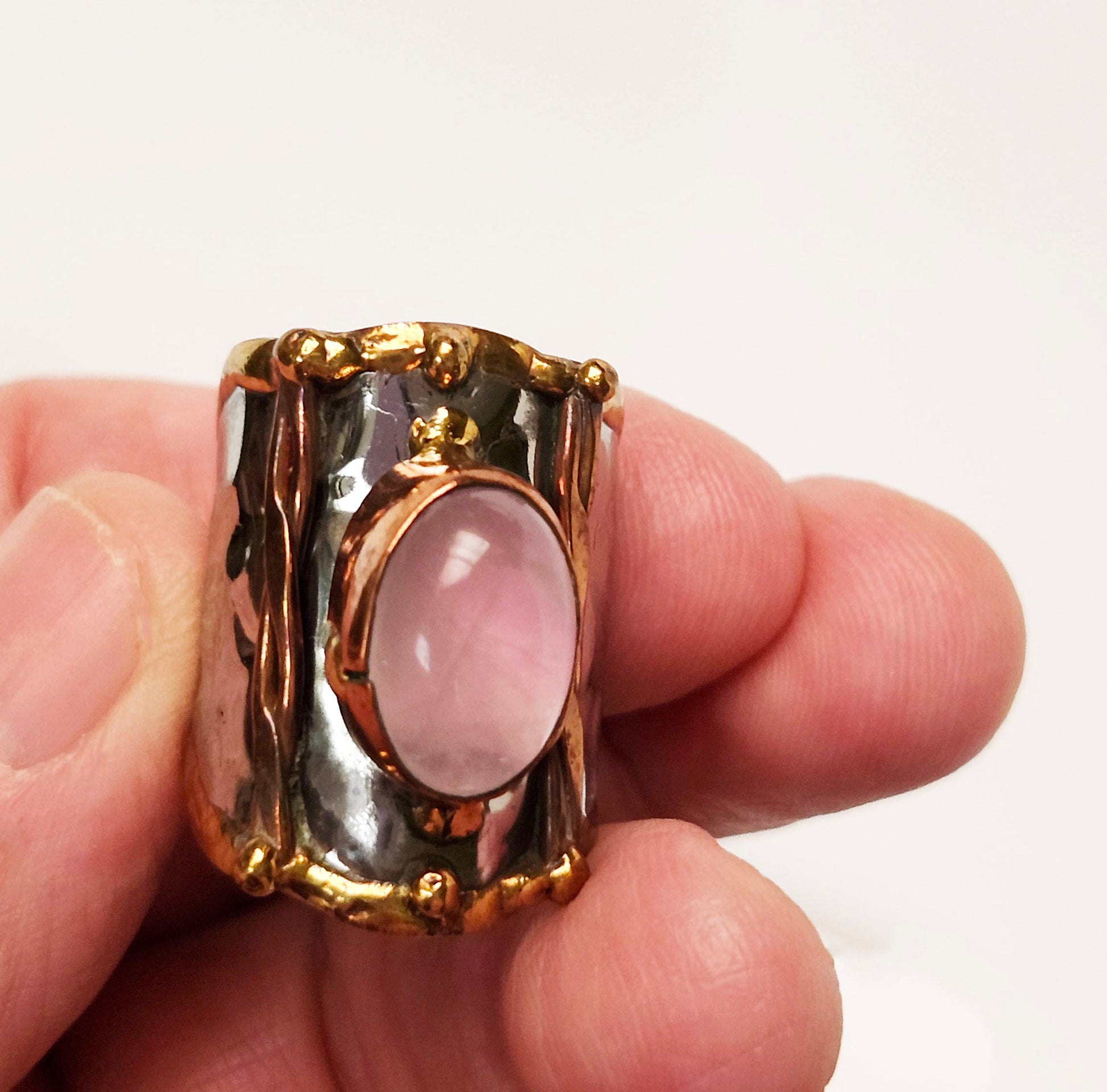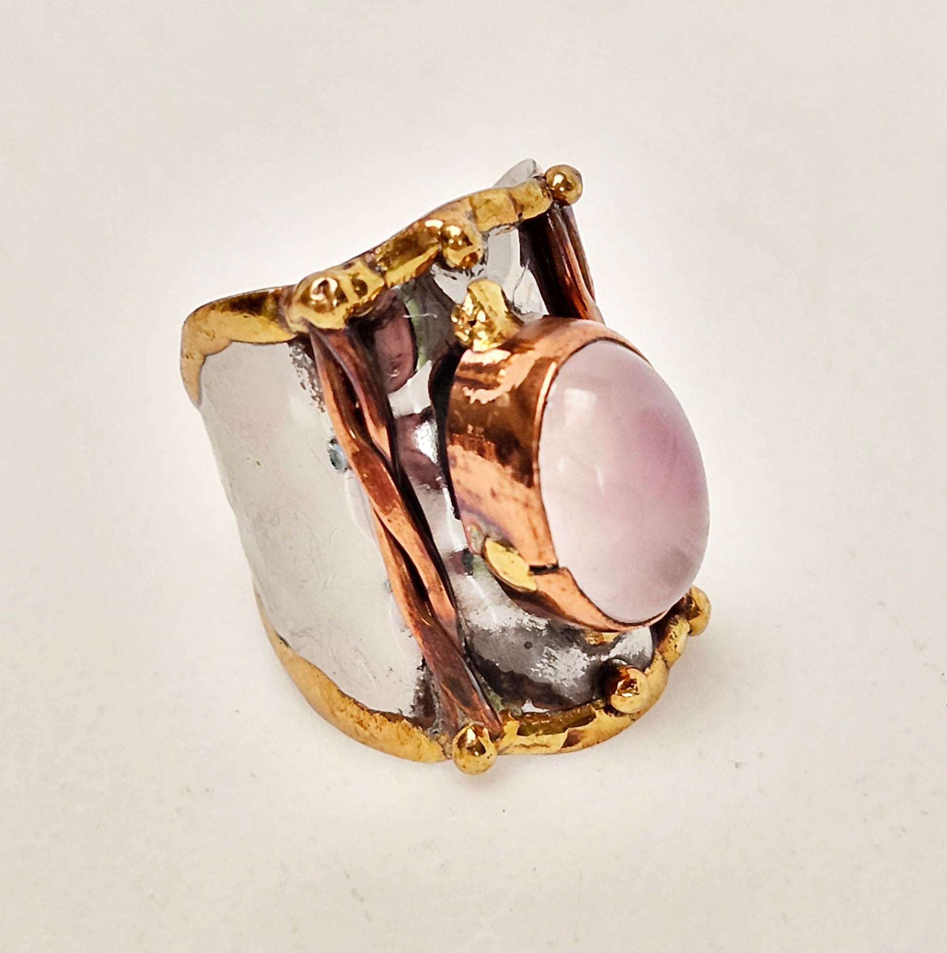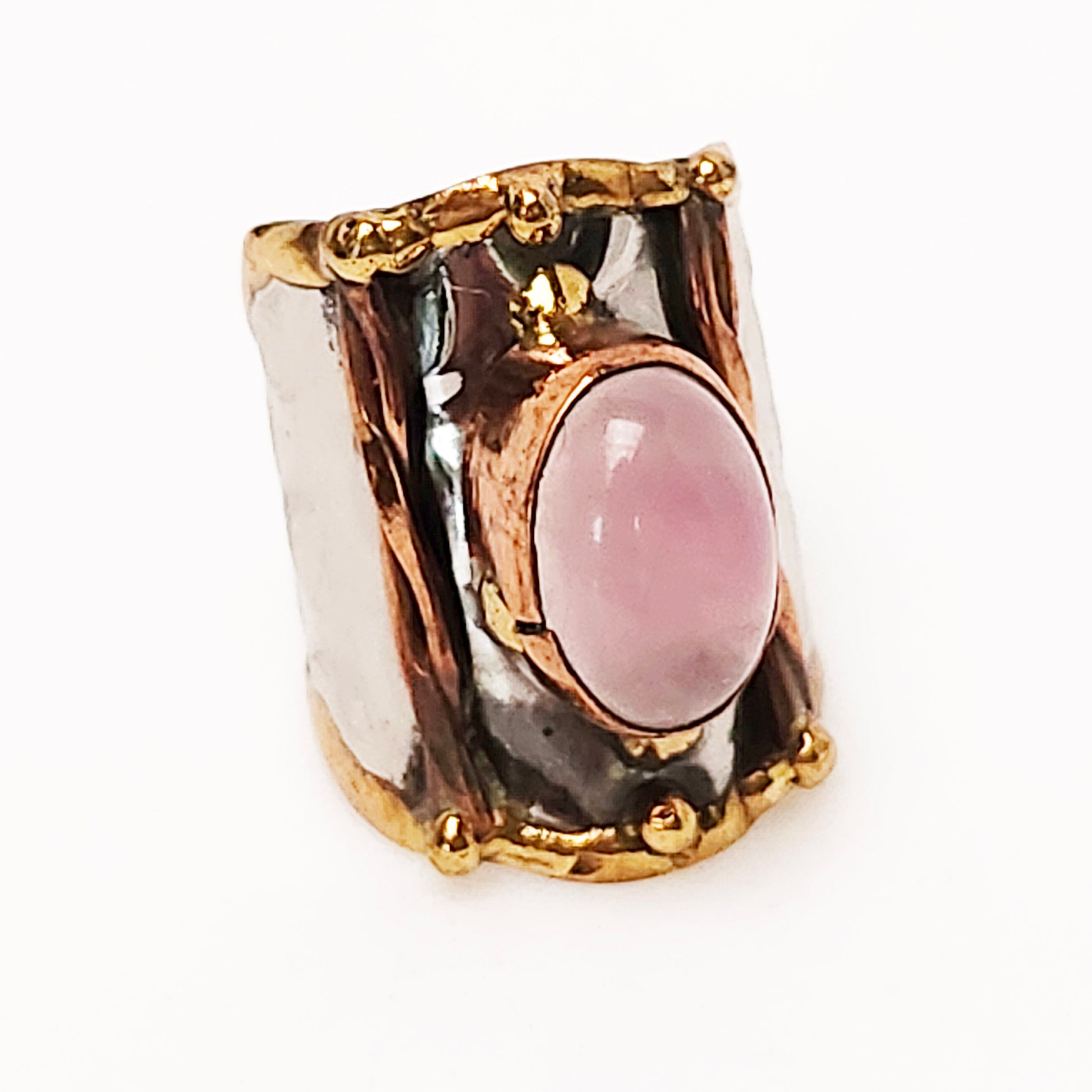 Mixed metal finger ring featuring a gorgeous oval shaped translucent pink semi precious stone.