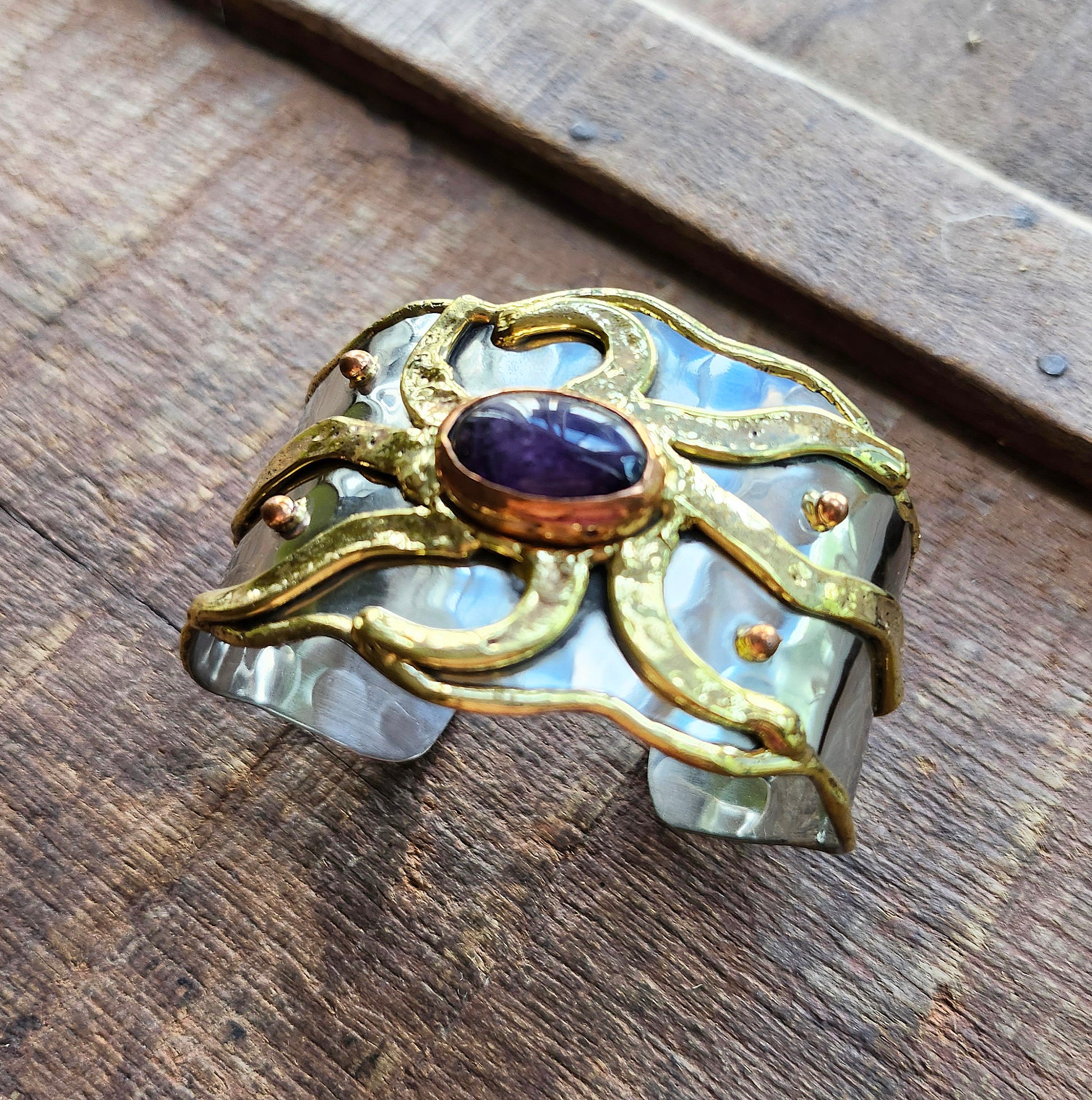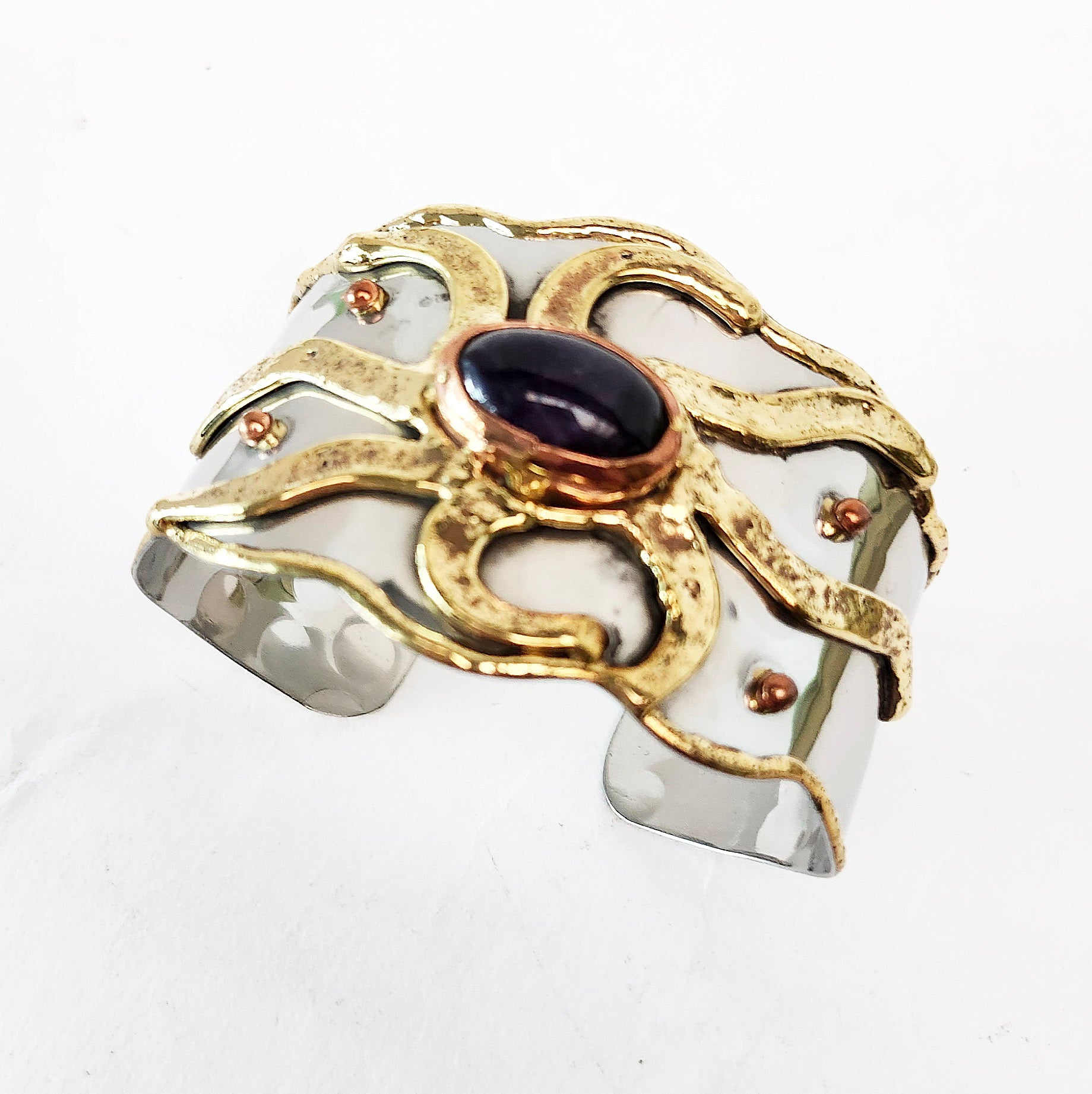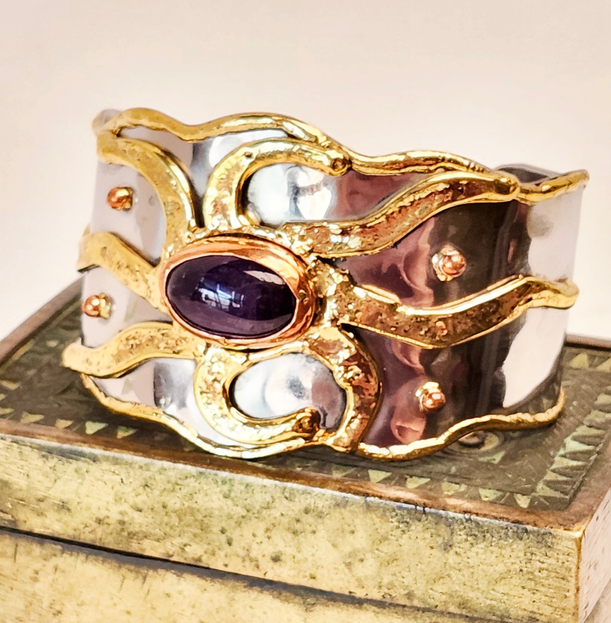 Silver cuff bracelet with a dark purple Amethyst Stone. Adjustable fit.