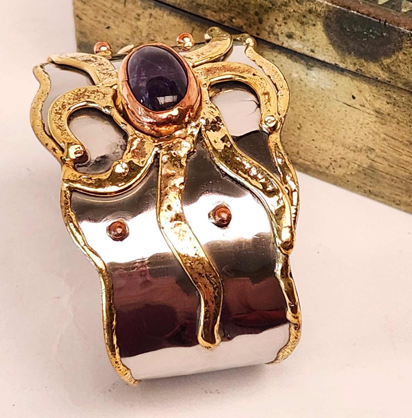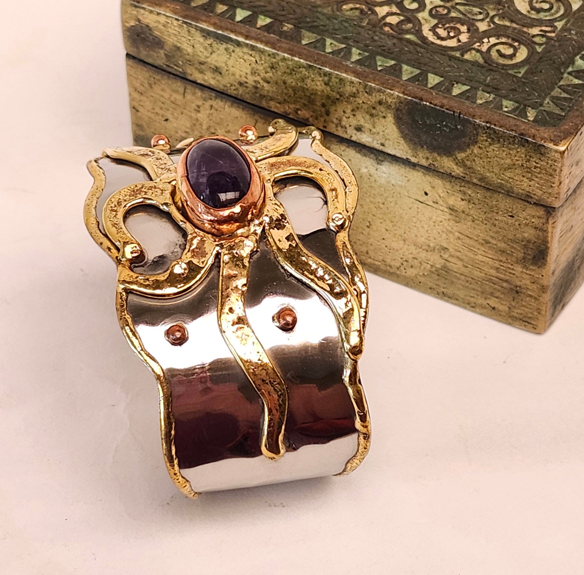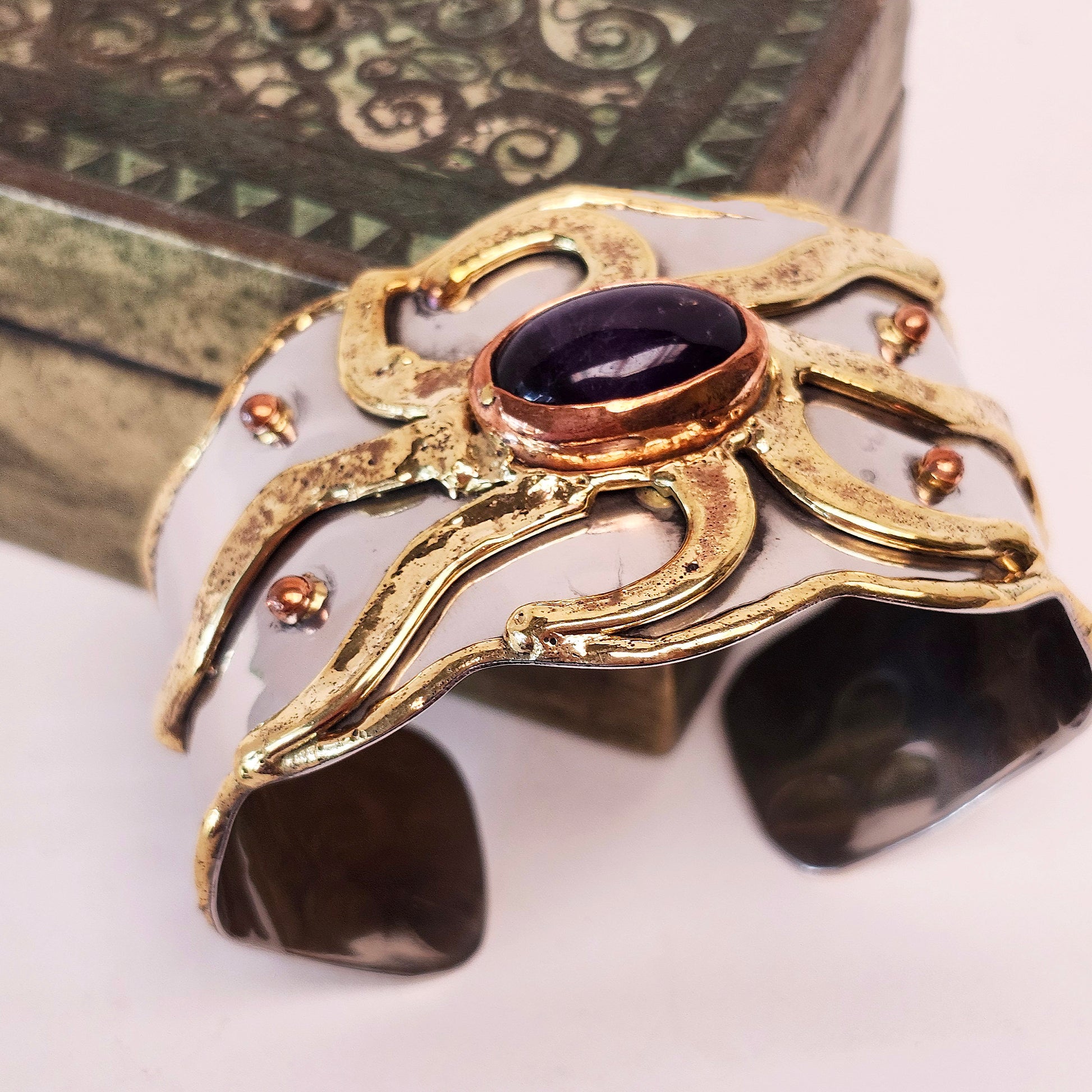 Silver cuff bracelet with a dark purple Amethyst Stone. Adjustable fit.