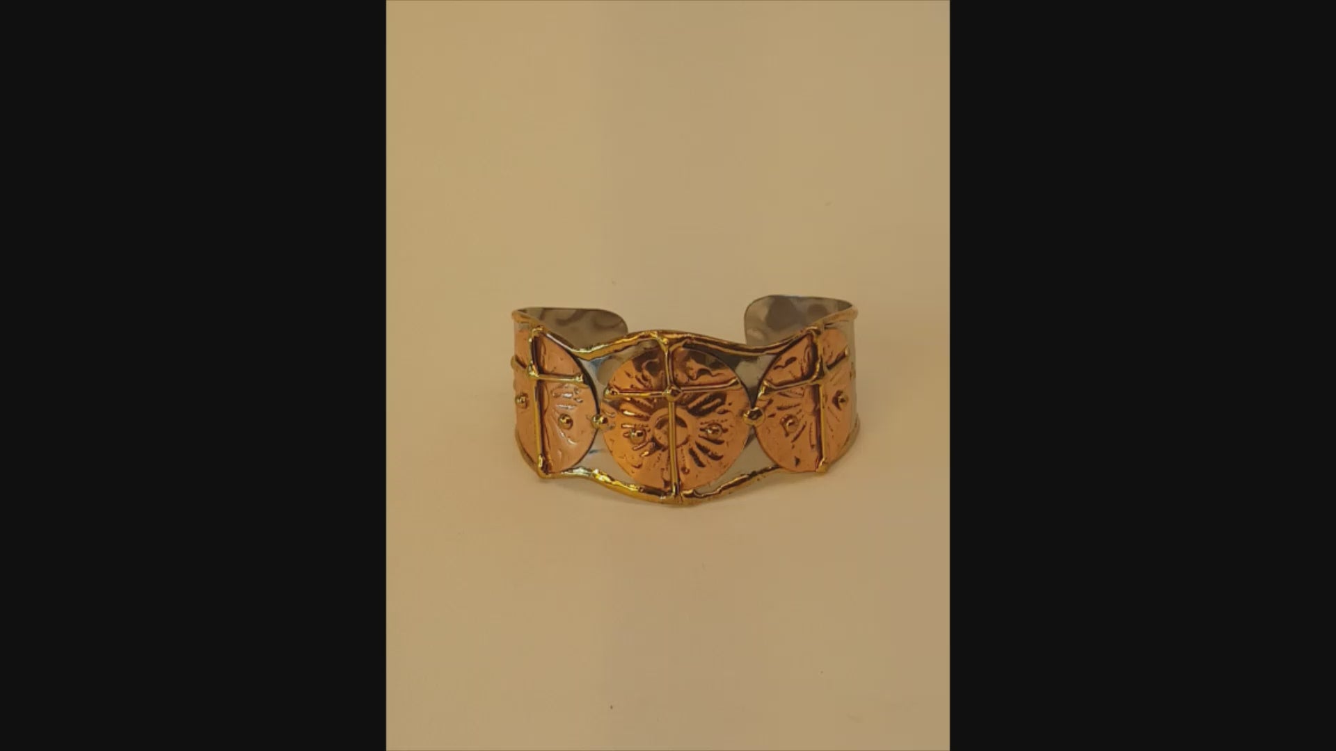 Mixed metals with molten brass work edging. Overlaid with a copper disc pattern.