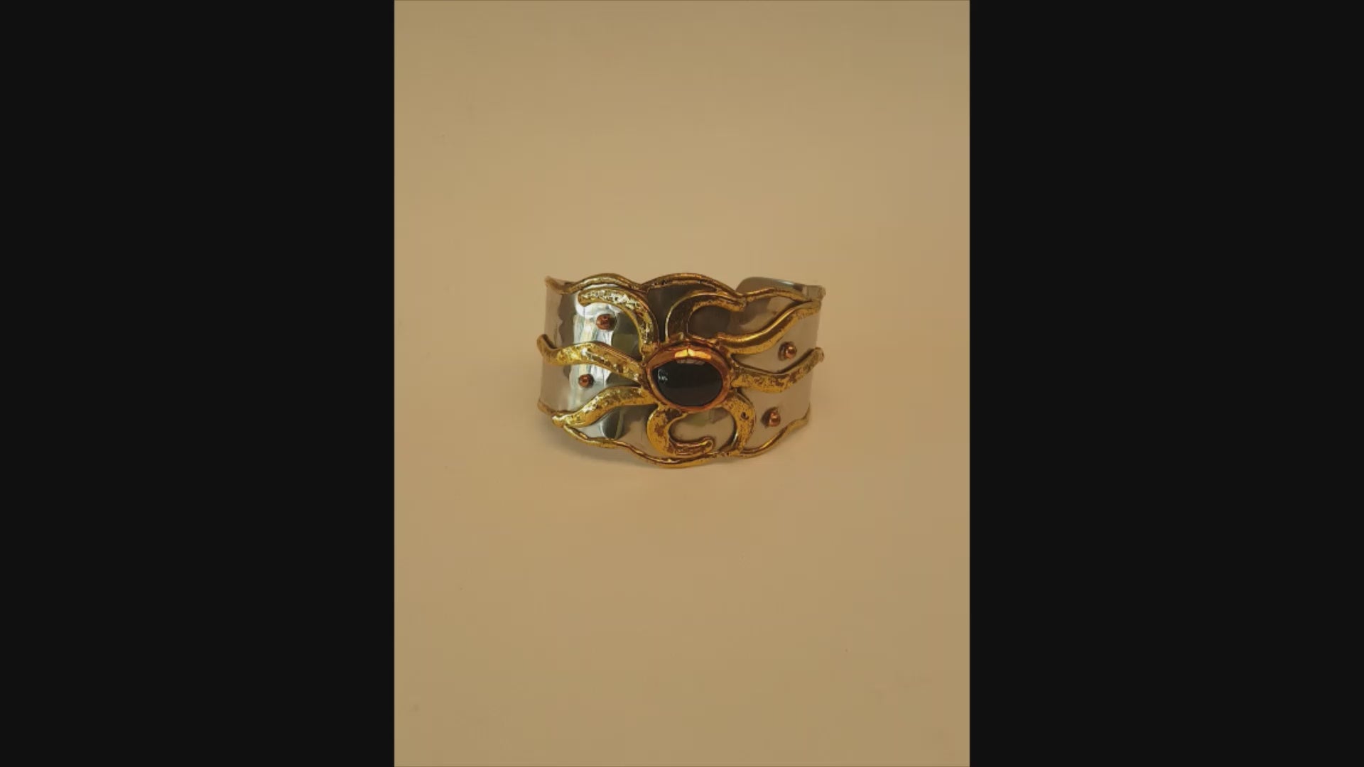 Silver cuff bracelet with inlaid gemstone center. Medieval Celtic sunrise design with brass detail. Vintage handwrought artisan metalwork.