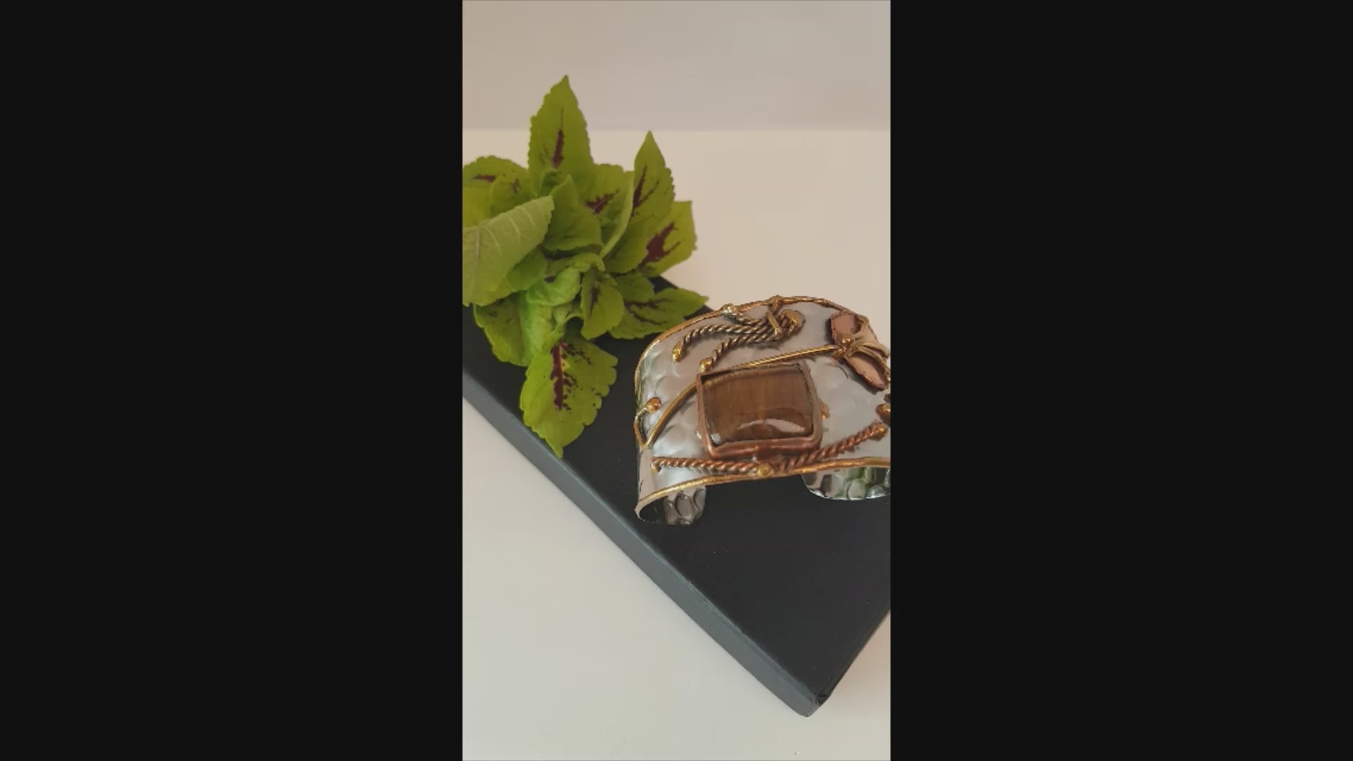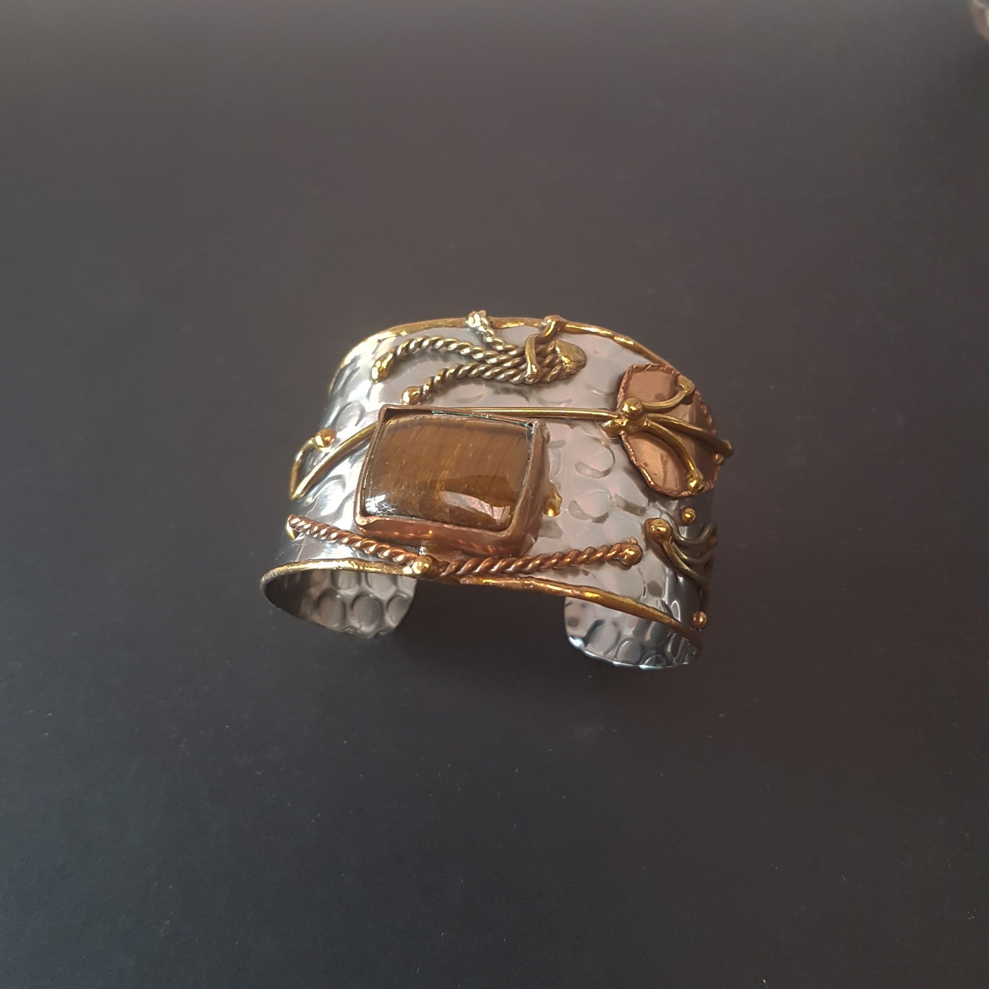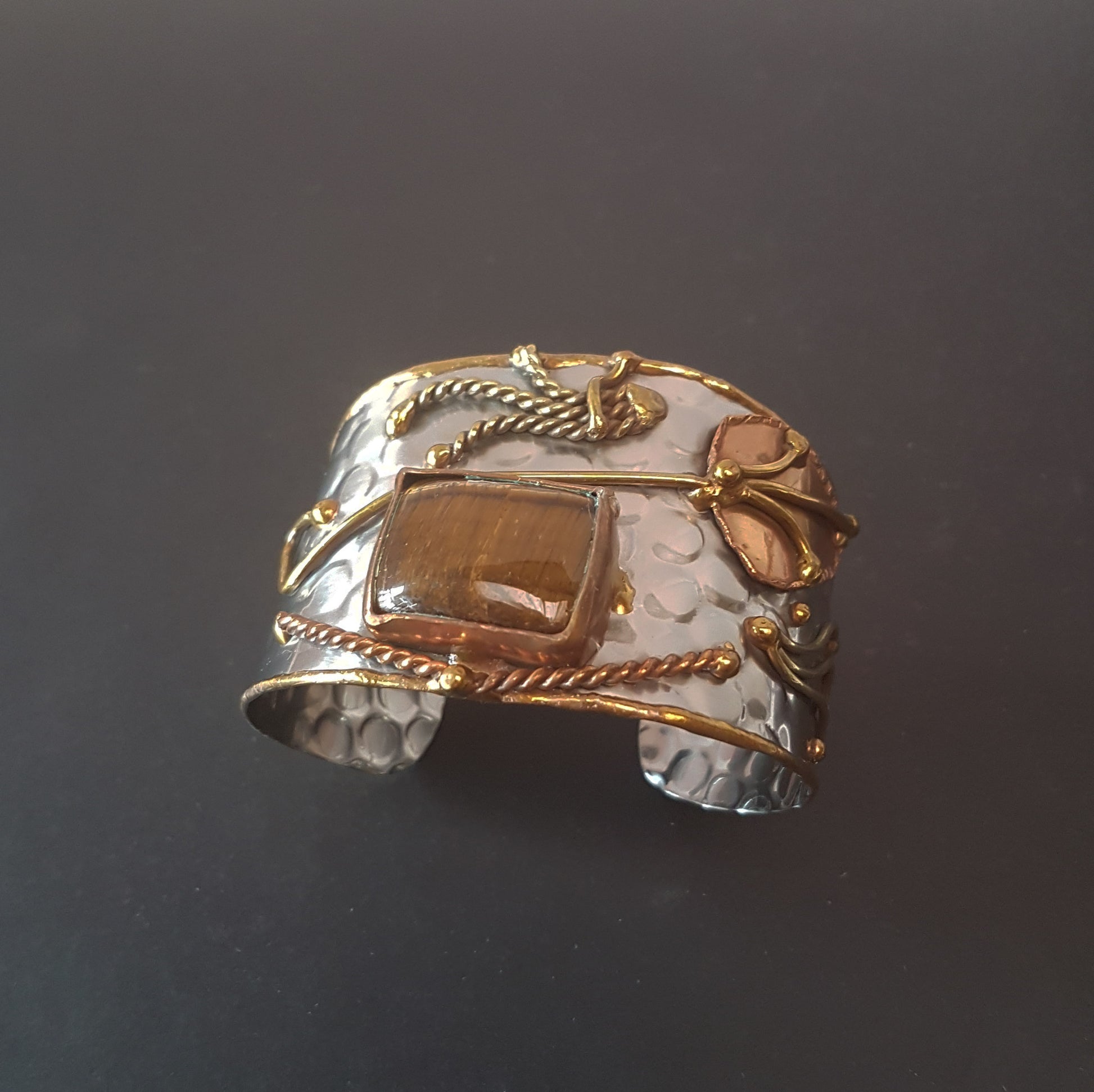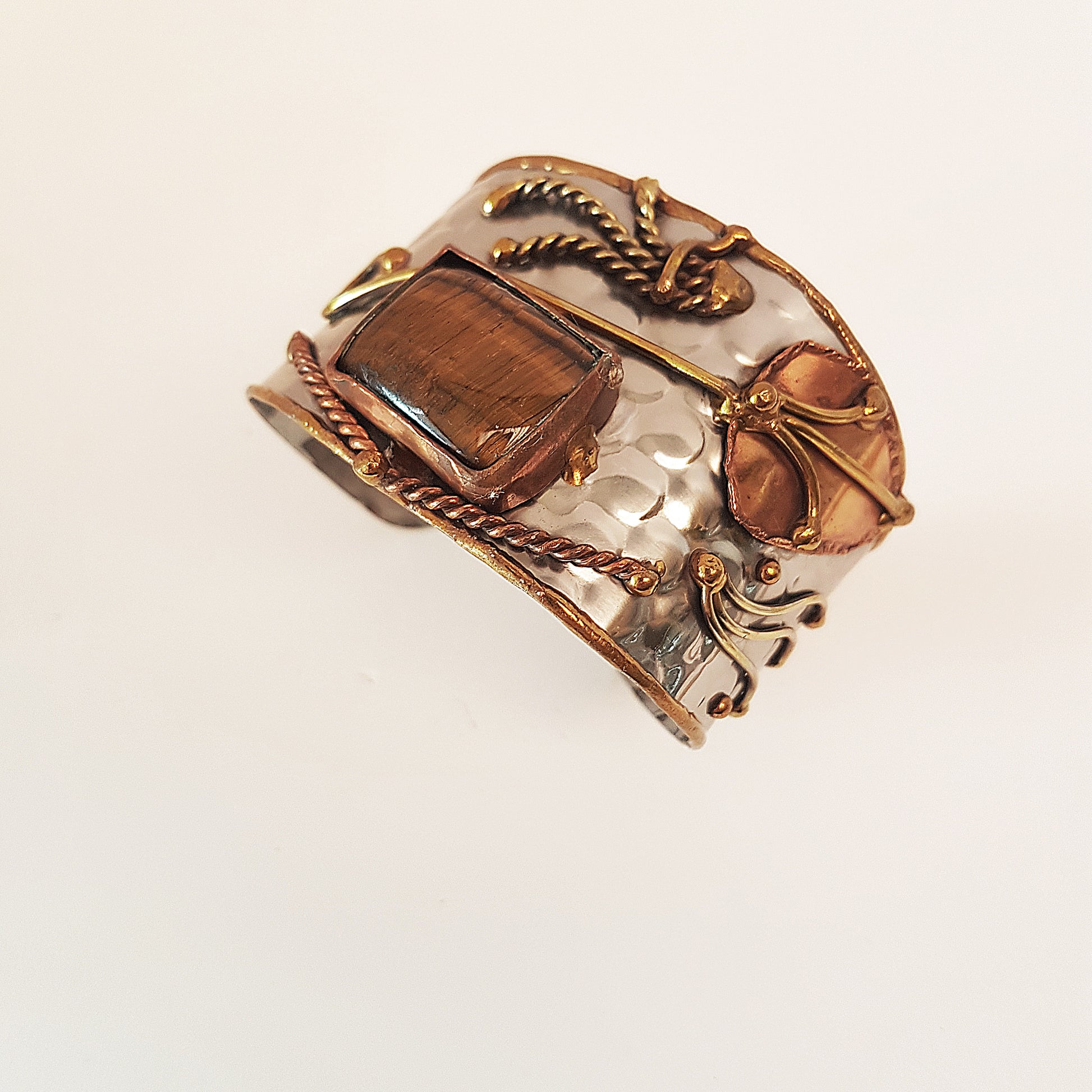 Hammered silver and mixed metal cuff bracelet with a rectangular shape tiger's eye inlaid stone.