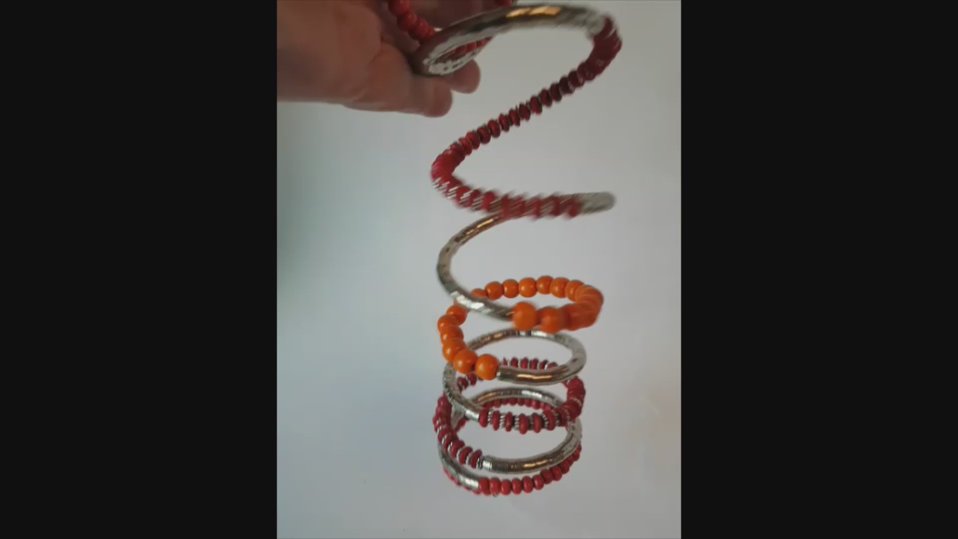 Tribal boho spiral wrap bracelet with adjustable memory wire. Hand made with colorful wood beads and silver metallic finish. Slinky toy design.