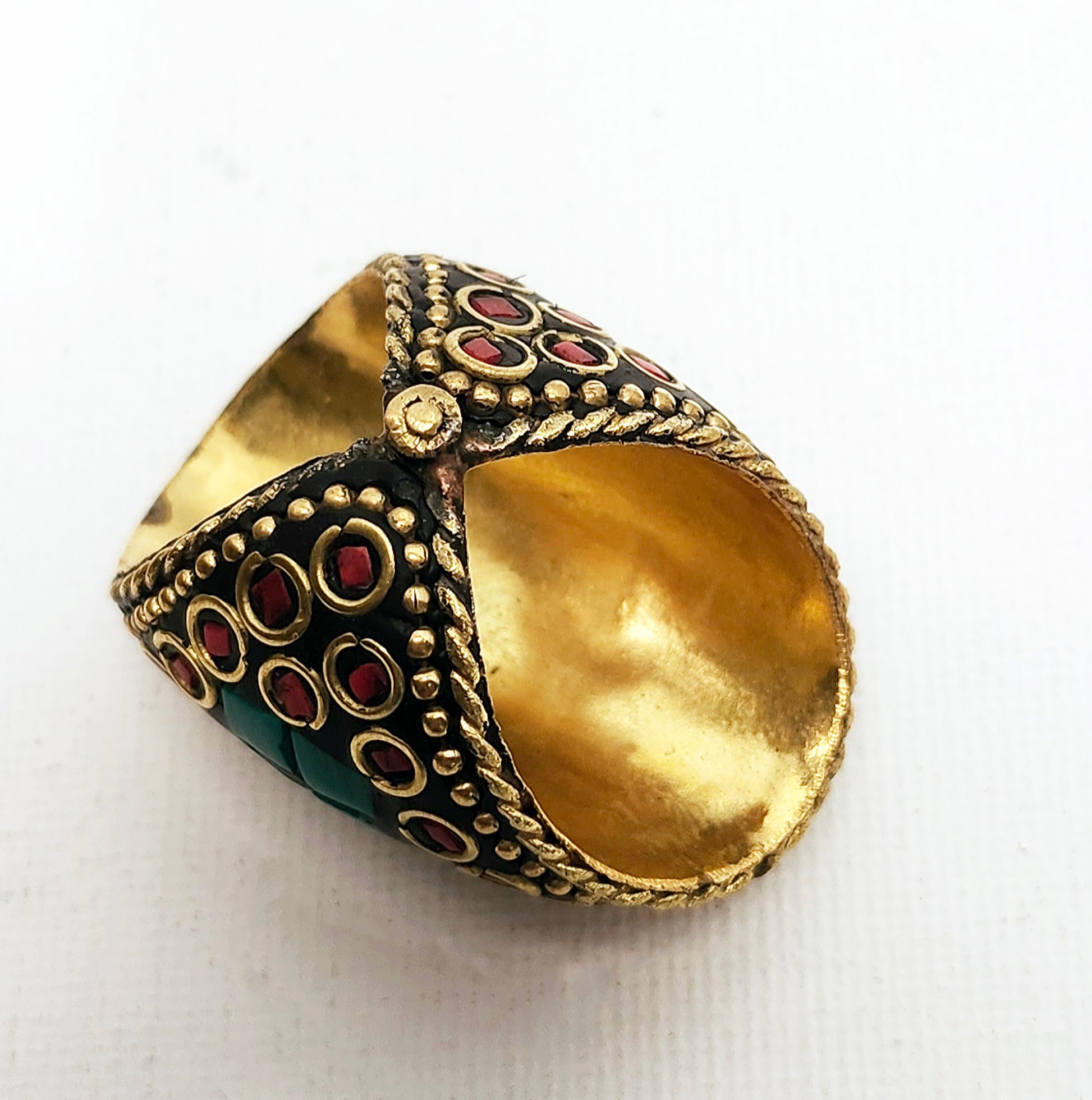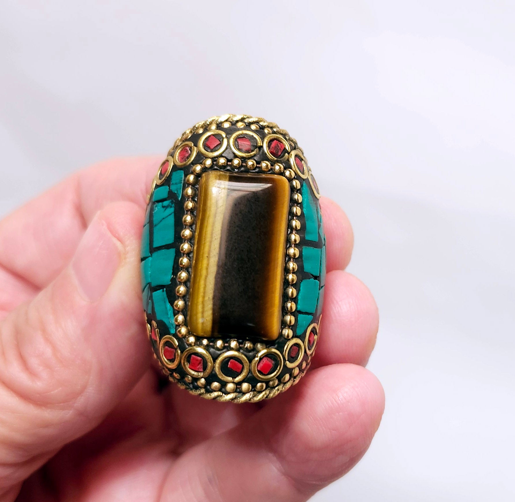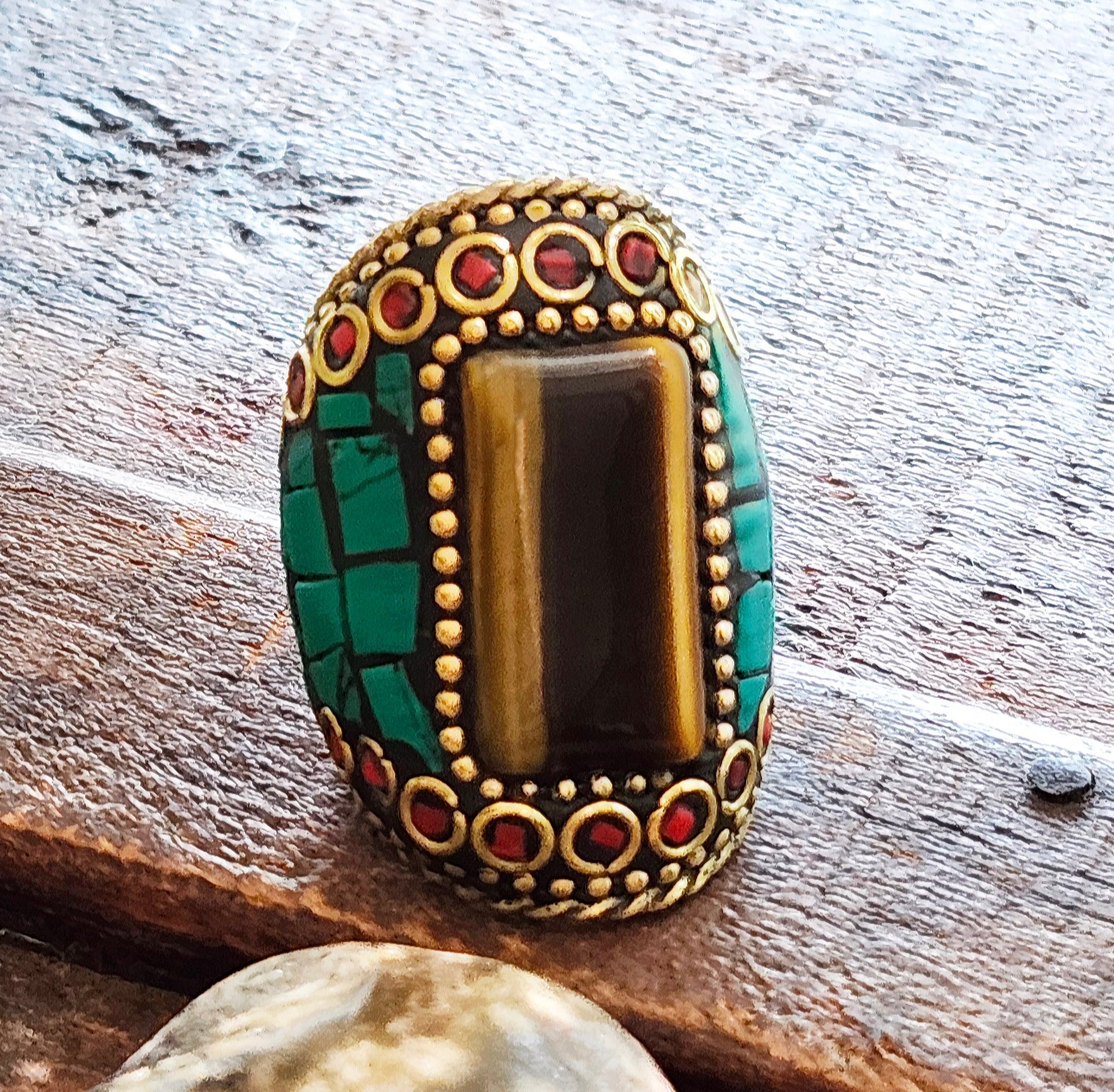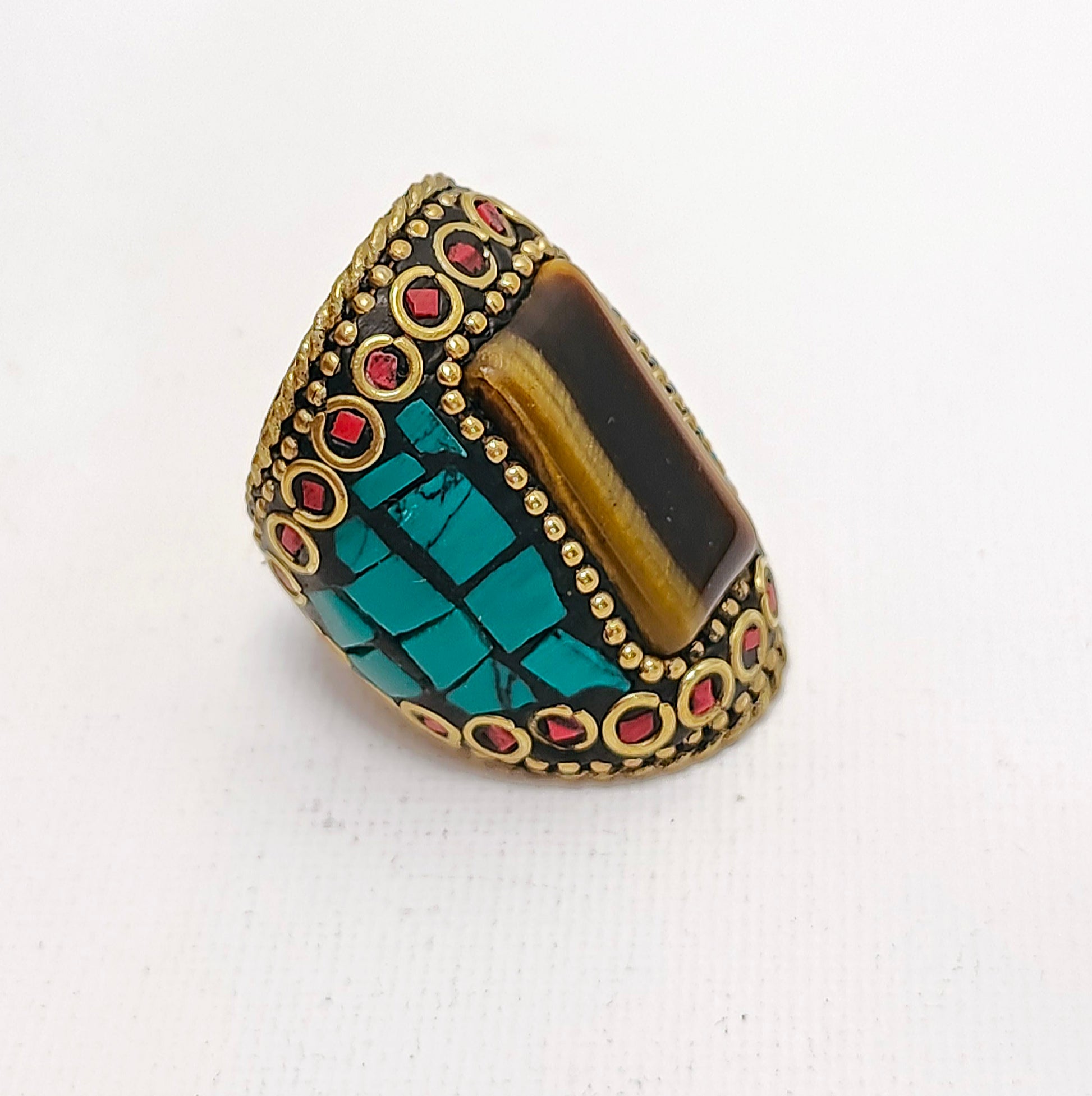 Turquoise Mosaic Ring with a Rectangular Tiger Eye Gemstone.